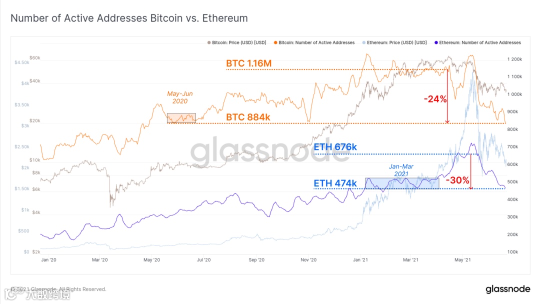 比特币和以太坊的链上活动都经历了显着放缓,活跃地址和总转账数量回落至 2020 年以及2021 年初的水平。比特币活跃地址从 3 月至 5 月初一直持续的 116 万个地址峰值下降了 24%。当前活跃地址数量884,000个,上一次看到这个情况还是去年。