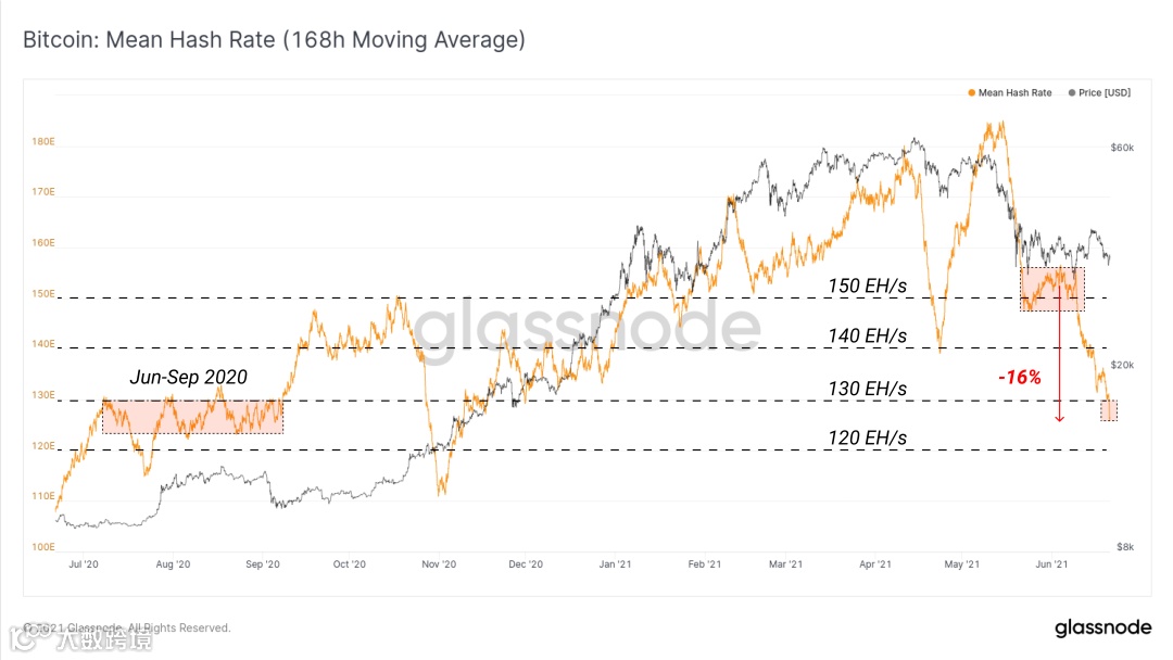 在过去的两周里,估计的平均算力(7DMA)下降了大约 16%,从大约 155 EH/s 下降到大约 125 EH/s。算力现已回落到 2020 年中期的水平。