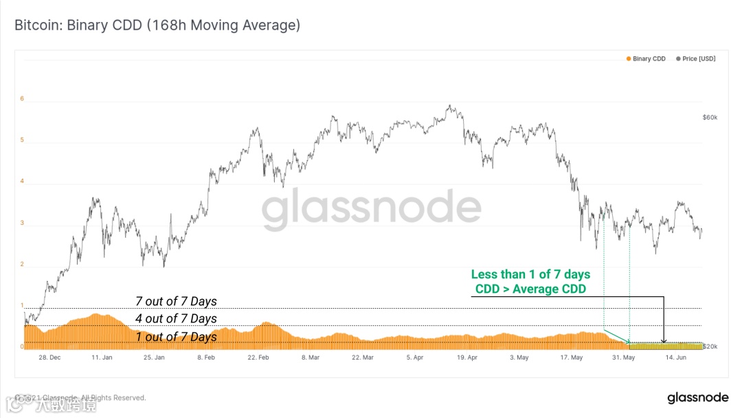 二进制 CDD 降得如此之低,以至于每 7 天中只有 1 天的寿命高于长期平均水平。这种状态几乎持续了整个 6 月,并在 5 月抛售后相对较快地开始,表明老手不愿意以这些价格出售。它还强调了对区块空间的需求是多么的少。