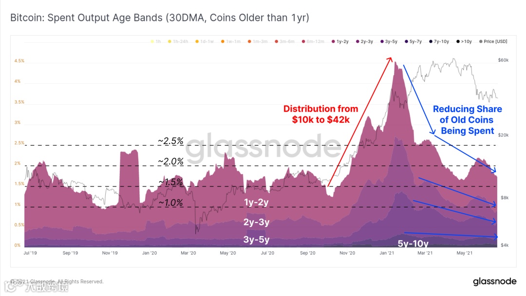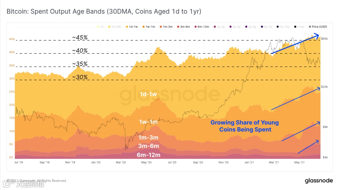 如果我们调查过去一年的总支出行为,我们会看到移动中的年轻代币(那些 < 1 岁,不包括 < 1 天)的比例作为交易流量的比例继续增加。在过去的几个月中,我们看到新的代币占总交易量的 45% 以上。这很可能是新市场进入者的结果: