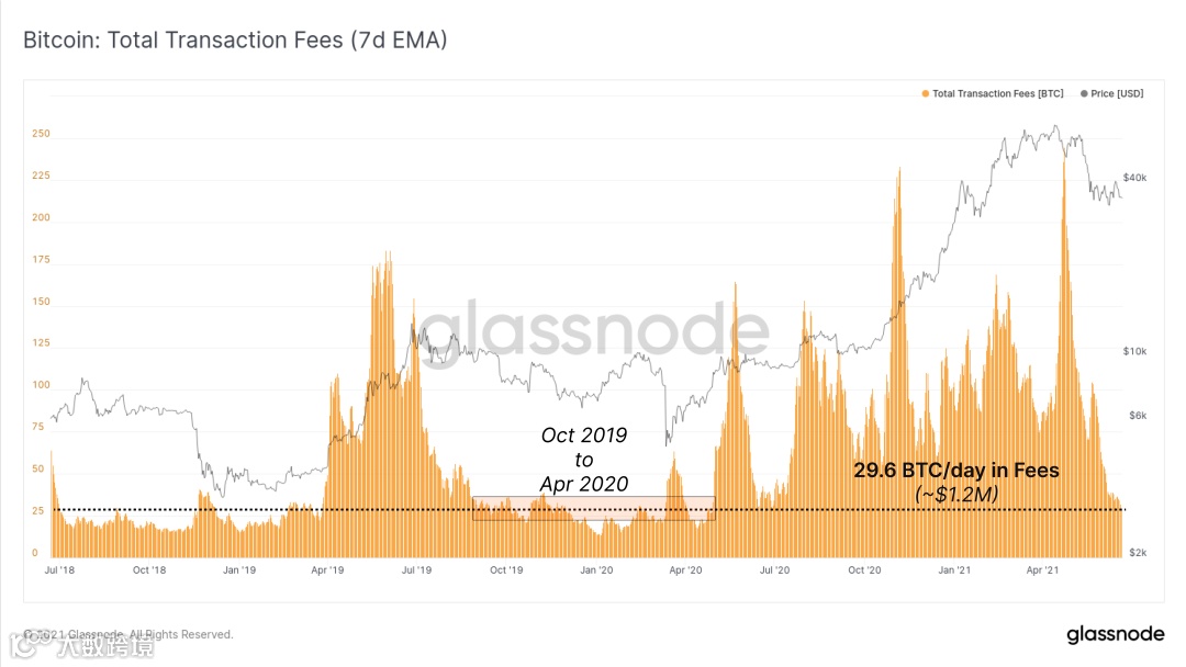 理所当然,随着网络拥塞几乎完全清除,包含在下一个区块中的优先费用显着下降。比特币支付的总费用已降至略低于 30 BTC/天(约 120 万美元),与 2019 年末和 2020 年初的水平一致。这目前约占矿工收入的 4%,而区块补贴则占剩余的 96%收入。