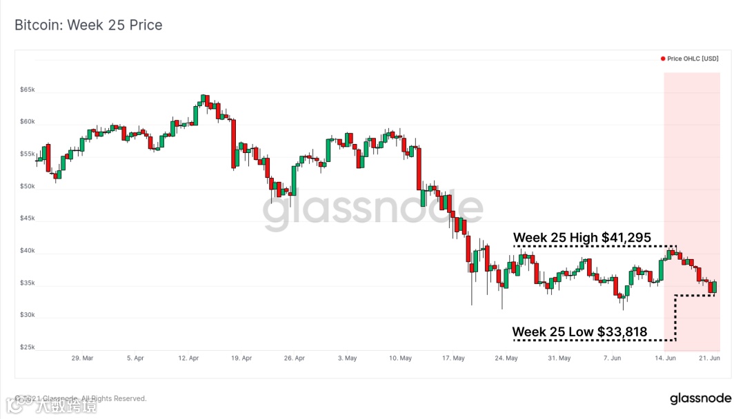 本周比特币市场在价格和链上活动方面继续表现出相对疲软。价格在最近的盘整区间内交易,从一周初的高点 41,295 美元跌至周末的低点 33,818 美元。