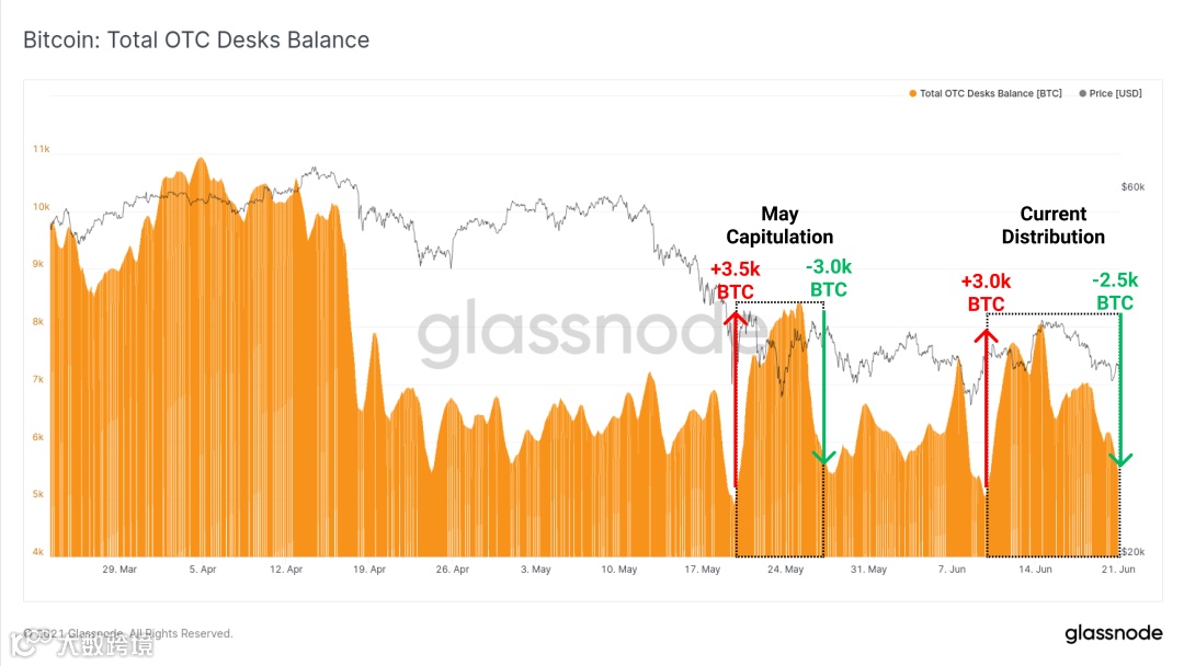 在 5 月的抛售和过去两周中,观察到 3.0 至 3.5 万枚比特币的净流入。然而,在这两种情况下,买家在短短几周内几乎吸收了全部流入量。总体而言,自 4 月以来,我们监测的场外交易柜台的 BTC 总持有量保持相对平稳。