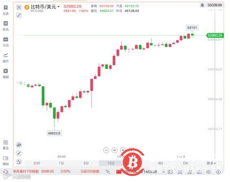 周一午后,比特币涨破53000美元/枚,日内涨幅近8%,有望创下2月8日以来的最大涨幅。这波反弹可谓相当凶猛,此前在周一早些时候,比特币一度跌至7周来的最低点,并一度失守47000美元关口。