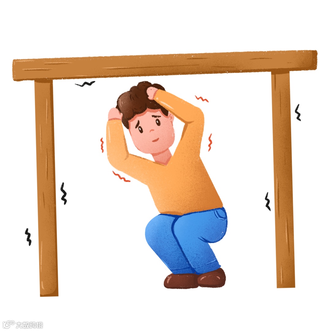 来不及转移时,应先蹲下,躲藏在写字台、桌子下方等空隙区域,并将身体紧贴承重墙作为掩护,双手抓牢固定物体。