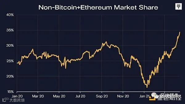 在过去三个月,非比特币+以太坊的市场份额已翻了一番以上,从16%增至34%。