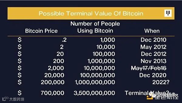 使用这些关系,我们可以推测比特币可能的最终价值。 如果按每百万名用户200美元继续上涨,比特币价格将达到70万美元。