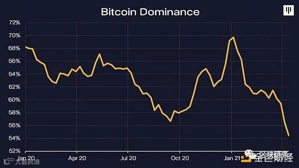 尽管它曾“疯狂地”反弹,但比特币在总市值中的份额(“比特币占比”)正在下降。 当其7倍市值产品失去市场份额时,它们是一个不错的资产类别。