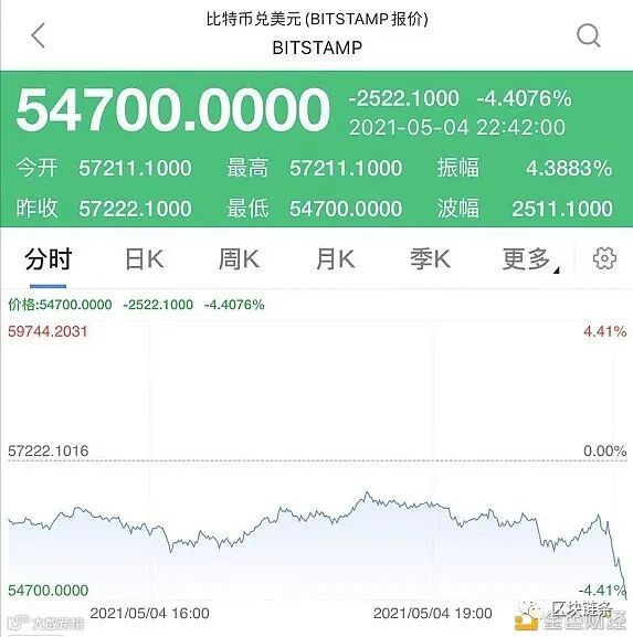 狗狗币狂欢的同时,大佬比特币却遭遇抛售:跌超4%。