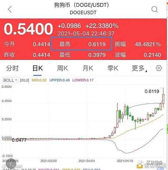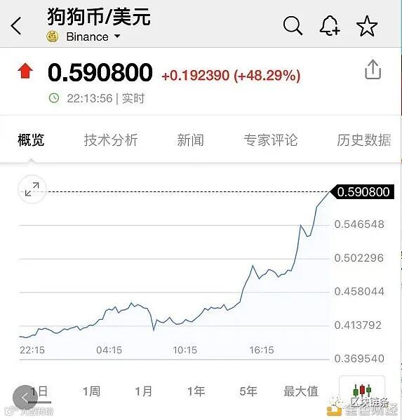 5月4日晚间,狗狗币24小时一度暴涨超50%,站上0.6美元/枚,刷新历史新高。过去7天的涨幅逼近100%,如果从今年年初算起,涨幅超过了100倍!