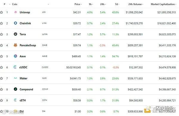 DeFi总市值及市值前十币种排名 数据来源Coingecko