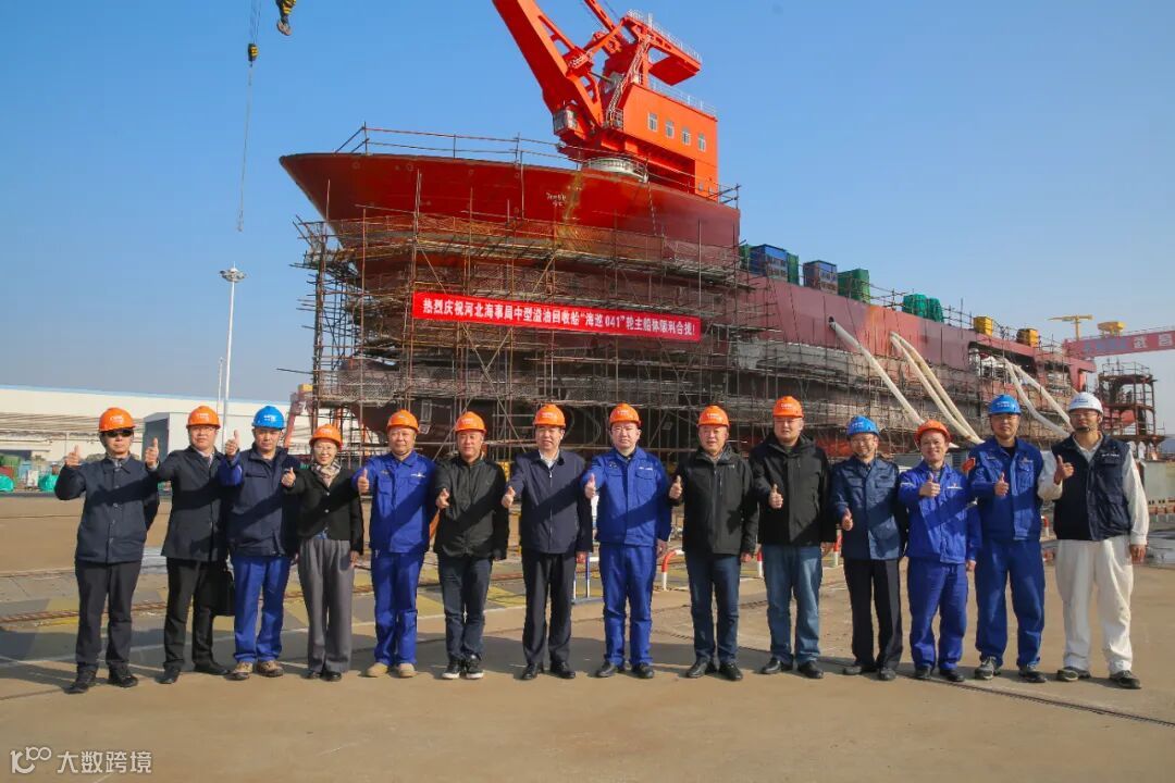 11月28日上午,武昌造船为河北海事局建造的海事系统最大溢油回收船“海巡041”主船体合拢仪式在武昌造船顺利举行。河北海事局党组书记、局长张铁军,副局长邓民,武昌造船党委书记、董事长姜涛共同到场见证。