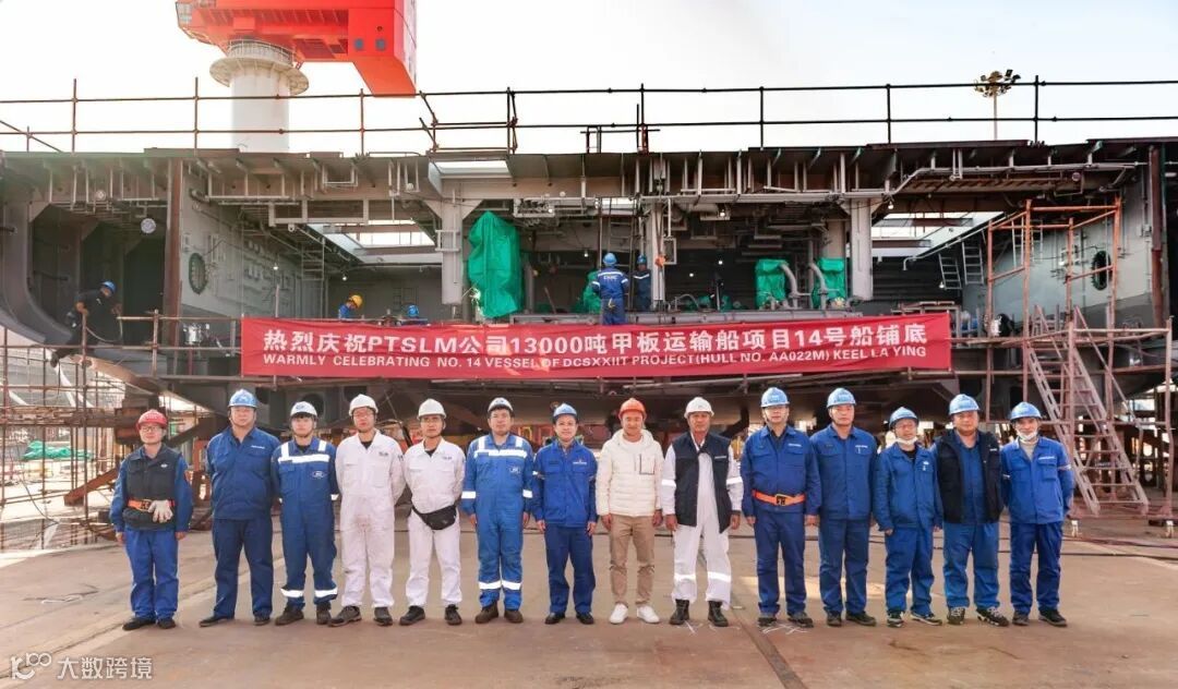 11月28日下午,武昌造船建造的13000DWT甲板运输船14号船按期顺利实现上船台节点。船东、船检以及参建单位相关领导参加仪式。