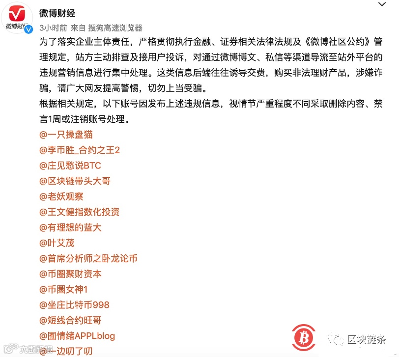 1月15日,微博财经官方发文称表示,为了落实企业主体责任,严格贯彻执行金融、证券相关法律法规及《微博社区公约》管理规定,站方主动排查及接用户投诉,对通过微博博文、私信等渠道导流至站外平台的违规营销信息进行集中处理。这类信息后端往往诱导交费,购买非法理财产品,涉嫌诈骗。根据相关规定,微博将对若干账号采取删除内容、禁言1周或注销处理。内容显示,这批账号包含一些区块链及币圈微博账号。