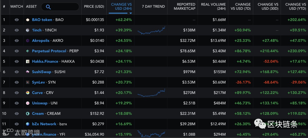 根据messari.io网站数据显示,主流DeFi币种在过去一段时间大幅上涨,AAVE和SNX连续刷新历史新高,其他包括寿司(SUSHI),UNI等表现越来越抢眼,日涨幅均达到 了两位数百分比。