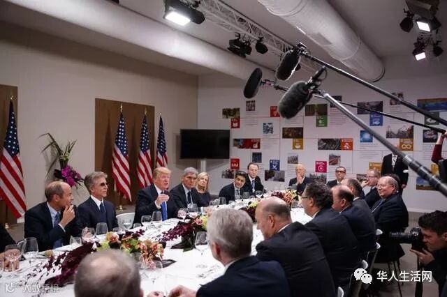 1月25日,特朗普在瑞士达沃斯出席“世界经济论坛”时与欧洲工商界领袖共进晚餐。