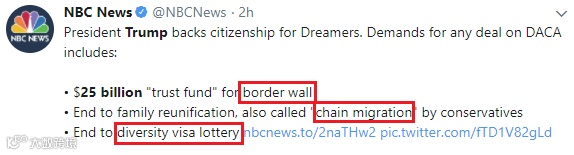 周四下午,白宫官员与国会民主党人举行了电话会议,白宫高级顾问斯蒂芬·米勒就移民法改革框架做了简报。该提案包含让目前在美国的180万年轻非法移民获得公民身份途径,作为一系列计划的一部分,其中还包括耗资250亿美元的边境墙和其它安全措施。
