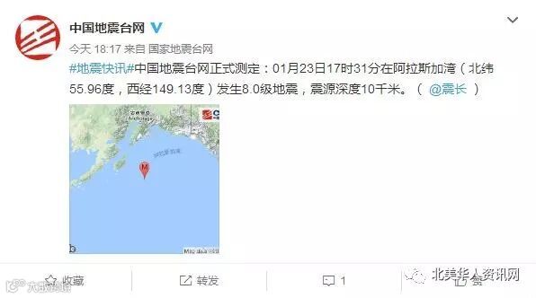 中国地震台网正式测定:01月23日17时31分在阿拉斯加湾(北纬55.96度,西经149.13度)发生8.0级地震,震源深度10千米。