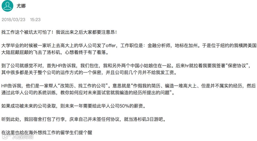 还有留学生遇到过更糟心事,比如在找工作时被自己人坑