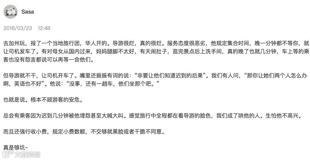 “去加州玩,报了一个当地旅行团,华人开的。导游很烂,真的很烂。服务态度很恶劣,他规定集合时间,晚一分钟都不等你,就让司机发车了。有对母女从国内过来,妈妈腿脚不太好,有天闹肚子,逛完景点后上洗手间,真的晚了也就几分钟,车上等的乘客也没有怨言都说可以再等一会他们。