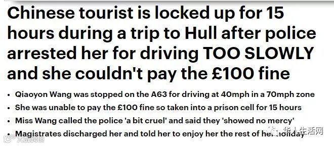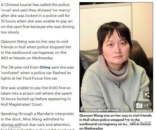1月17日,39岁的中国女子王乔咏(音译,Wang Qiaoyon)到英国旅游,她在英国高速公路开车时,由于驾驶速度过慢被警察截停。