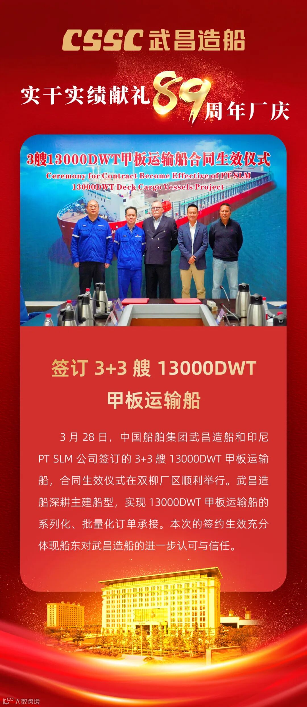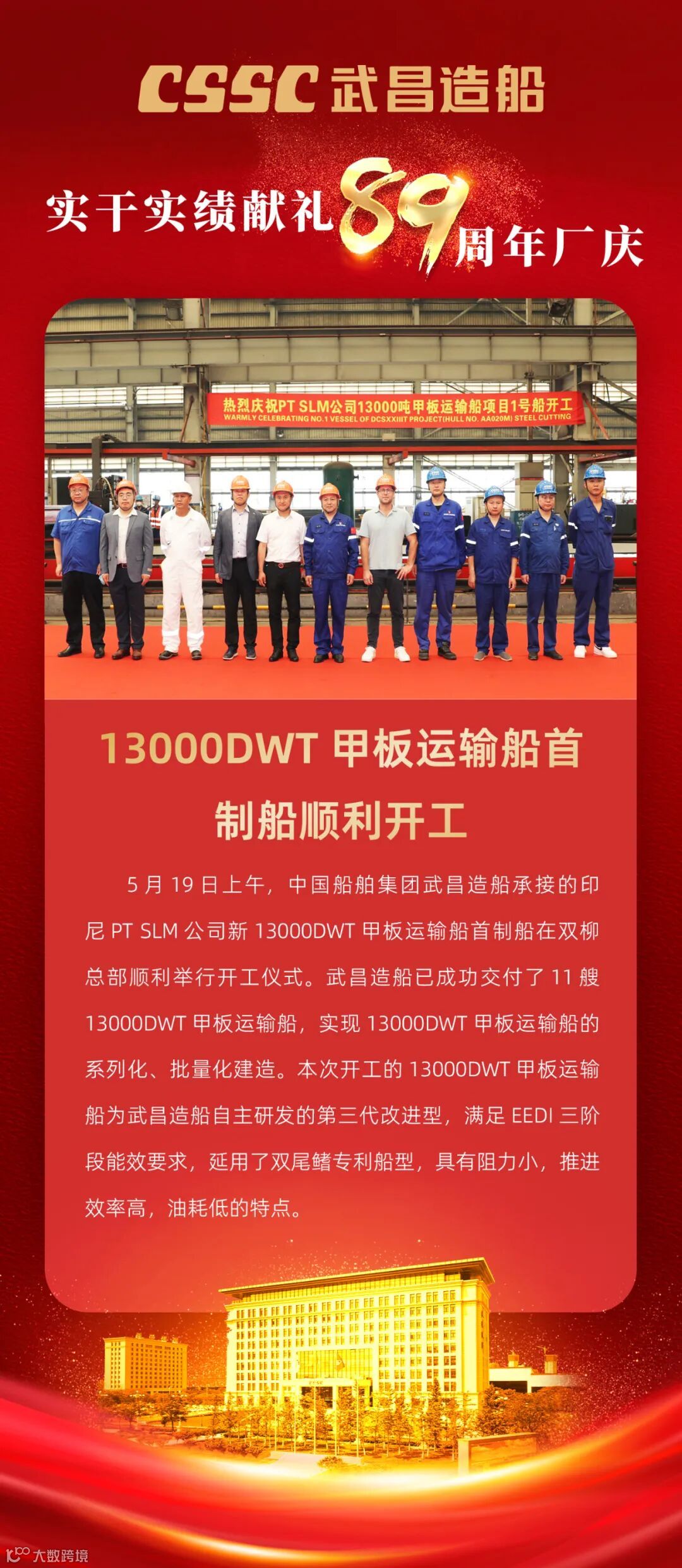 6月5日,PT SLM新13000DWT甲板运输船2#、3#船,在中国船舶集团武昌造船双柳厂区开工建造,这是由武昌造船自主设计并建造的为东南亚细分市场精心打造的精品船舶。本次开工的两艘船舶,是武昌造船建造的13000DWT甲板运输船系列船的第13#、14#船。
