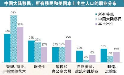 在职业方面,51%的中国大陆移民从事管理、商业、科学和艺术职业,而所有外来移民从事这类职业的比例为32%,美国本土出生人口从事这类职业的比例为39%。22%的中国大陆移民从事服务类职业,而所有外来移民从事这类职业的比例为24%,美国本土出生人口从事这类职业的比例为17%。17%的中国大陆移民从事销售和办公室文员职业,而所有外来移民从事这类职业的比例也为17%,美国本土出生人口从事这类职业的比例为25%。3%的中国大陆移民从事自然资源、建筑和维护职业,而所有外来移民从事这类职业的比例为13%,美国本土出生人口从事这类职业的比例为8%。7%的中国大陆移民从事制造、运输职业,而所有外来移民从事这类职业的比例为15%,美国本土出生人口从事这类职业的比例为12%。