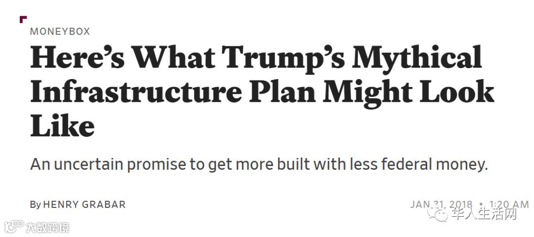 目前,有关特朗普将如何应对美国日益恶化的道路和桥梁设施的消息都是大家的猜测。尽管在当地时间周二晚上的国情咨文演讲中,特朗普总统呼吁国会通过一项法案,投资1.5万亿美元用于改善美国的基础设施建设,但是他并没有透露过多的细节。目前还尚不清楚这笔资金中,有多少来自美国政府,有多少将被杠杆化。特朗普的想法是,用少量的联邦政府投资激励美国各州和各城市促进消费,或者找私人投资者来负责基础设施建设项目,又或者两者兼而有之。这听来像是美国政府的一笔划算交易:为几千亿美元的“标价”制定1.5万亿美元的计划。