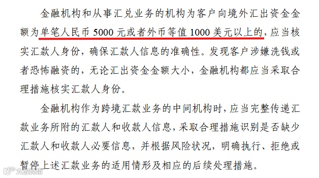 人民币跨境汇款金额超过 5000 元、美元超过 1000 元时,需提供汇款人身份信息及资金用途证明;