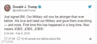 特朗普称:“刚刚签署了法案。我们的军队现在比以往任何时候都强大。我们热爱并且需要我们的军队,应该给予他们所有的东西...”