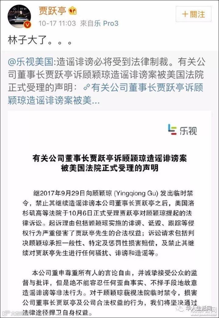 鉴于顾颖琼的行为已经严重侵害贾跃亭及其家人的名誉,并对贾跃亭为乐视控股所负债务尽责到底的不懈努力及对全球汽车行业的合法投资造成损害,贾跃亭将在中美两地对顾颖琼提起诉讼。