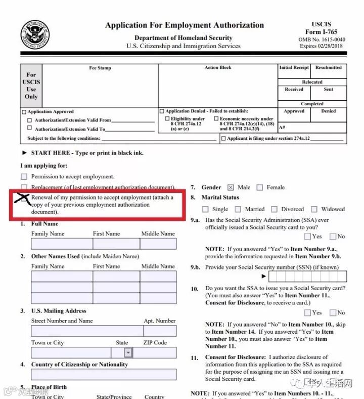 新版I-765表格增加了申请社会安全号的问题,申请人不需要专门去社保局提交材料,只要在新表格中填写相关选项,在上面表格红格选项里面划×,就可以,一般在美国填写表格都是划×,而不是在中国填写表格划√。