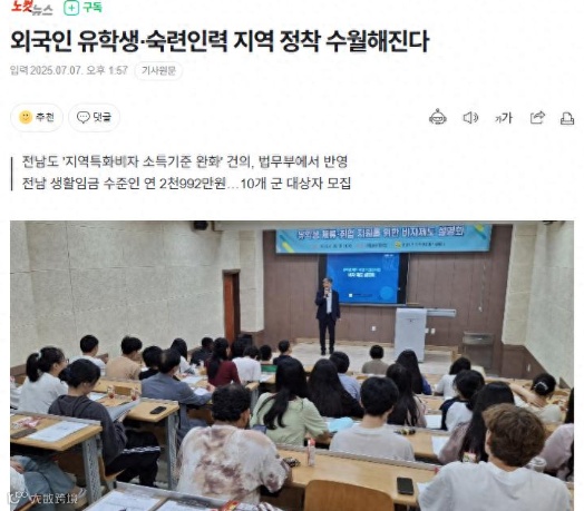 7月7日,韩国全罗南道官方宣布,法务部正式采纳“放宽地区特化签证(F-2-R)收入标准”的建议,这一举措将极大地便利当地外国留学生与熟练劳动力的长期居留和定居。
