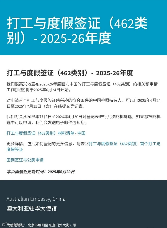 2025 年澳洲打工度假签证(462 签证)即将在明天(6月24日)面向中国大陆开放预申请!这无疑为众多渴望体验异国生活、边打工边旅行的年轻人带来了绝佳的机会。不过,这一签证中国人一生仅能申请一次,机会难得,有意向的申请人一定要提前做好准备!今天,小编就为大家详细梳理了澳洲打工度假签的申请条件和流程,希望对各位申请者有所帮助!