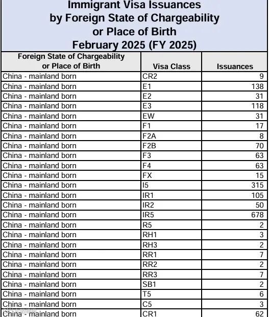 2025年2月,中国大陆出生者移民签证签发量前10名中,亲属团聚类签证占据6席,凸显家庭纽带在移民中的核心地位: