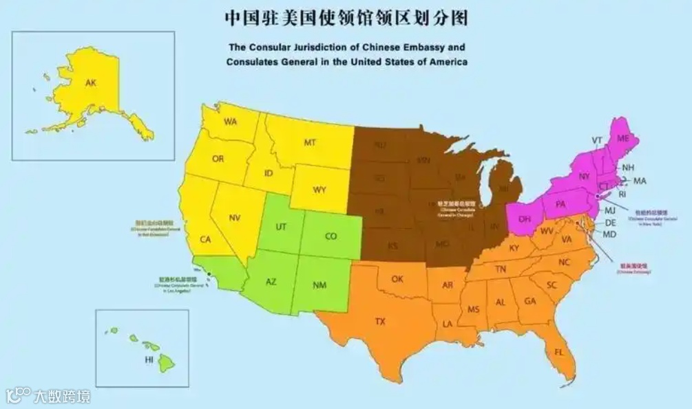 中国驻洛杉矶总领馆:南加州、亚利桑那州、新墨西哥州等;