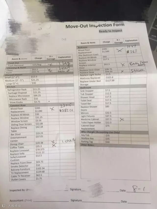 因为该栋公寓位于南加大(USC)校园附近,六层楼的建筑里有900多个居住单位,很多留学生选择住在这里。 Tom是南加大的学生,因为毕业于今年7月搬出了居住两年的公寓。他说,在这里居住经历很不错,有保安、健身房和各种娱乐设施。更重要的是,很多南加大的中国留学生都住在这里,平时可以一起学习玩耍,很方便。在搬走约两周后,他收到了公寓的「搬出检查单」,上面列了约十项家具维修费,总计1000多美元。