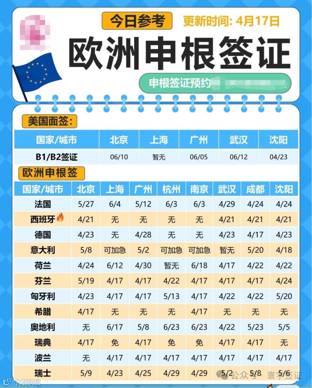 全球申根各国签证最新可预约面签时间速递(4月17日)