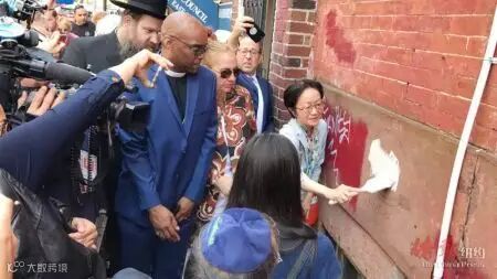 民选官员和社区人士27日举行集会,谴责一个针对下东城犹太教堂的仇恨涂鸦事件,并共同用油漆涂抹掉墙壁上的涂鸦,象征着以团结对抗仇恨。