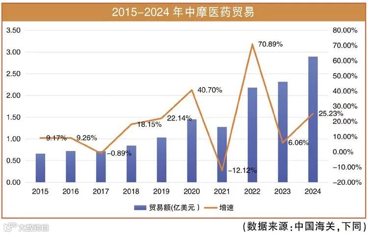 中国海关数据显示,双边医药贸易额从2015年的0.66亿美元增至2024年的2.9亿美元,增长超3倍,年均复合增速达17.8%。2024年,双边医药贸易额达到近十年来最高水平。