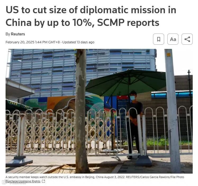 但美媒也强调,随着美政府内部辩论的继续,削减计划和相关提案也可能会发生变化。但是据知情人士称,此次受影响机构包括美国驻华大使馆,以及驻广州、上海、沈阳、武汉和香港的总领事馆。无论是美国派来的外交官还是中国当地雇员,都可能受到波及,他们最早在2025年2月21日就可能接到遣散费、离职日期等内容通知。