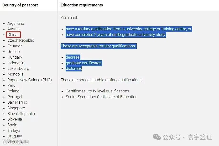 对于中国大陆的申请者,需要满足一些申请条件:比如持有有效中国护照、申请时年龄必须在18周岁至30周岁(含)之间、此前未曾持打工度假签(462子类或417子类)入境澳洲,以及拥有大学、学院或培训中心的高等教育资格,或者已完成两年本科大学学习等。