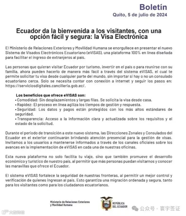 从2024年6月开始,厄瓜多尔外交部提供电子签证服务,其目的是让用户可以更轻松地在驻外领事馆或该国的地区办理此类手续。