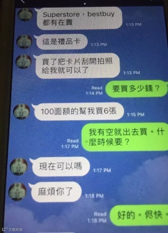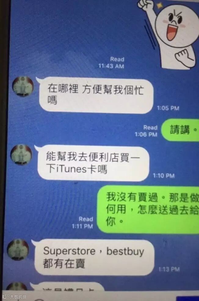 橙县普安那公园(Buena Park)华人居民Tony指出,16日下午1时左右收到洛县一位「朋友」透过LINE请求帮忙,请他立即去便利店买六张100元面额的iTunes礼品卡并拍照发回,还表示「钱明天或者晚点有空给你」。想帮朋友的Tony在连锁超市Target购买了五张100元面额的礼品卡并发给骗徒后,与真正的朋友电话确认是否收到礼品卡时,才发现上当,损失却难以挽回。