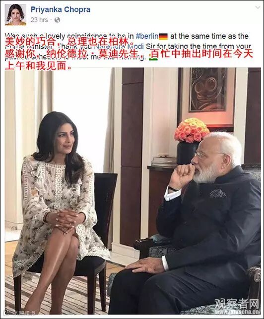 当地时间5月30日,乔普拉在脸书上发了一张与印度总理莫迪见面的照片。