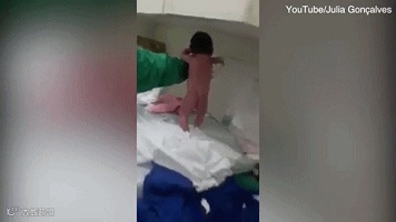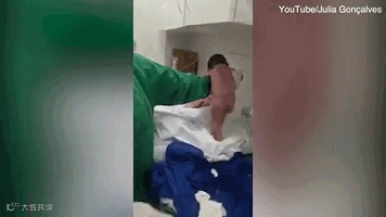 报道称,该视频在未计入其他国家的情况下,仅在国外视频和社交网站播放量就高达5000万以上,图为新出生婴儿行走的动图。