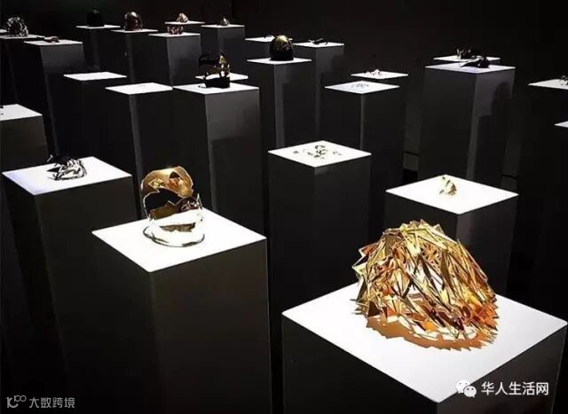西蒙·伯奇介绍称,被女孩撞倒的那一列一共有16个陈列柱,上面摆放着由3D技术打印出来的皇冠雕塑作品,有的是使用尼龙或者镀金的黄铜制作而成,有的是这两种材质都包含,还有的则是由花岗岩和大理石等其它材料制成。但共同点是,这些材料制作的皇冠都是易碎品。