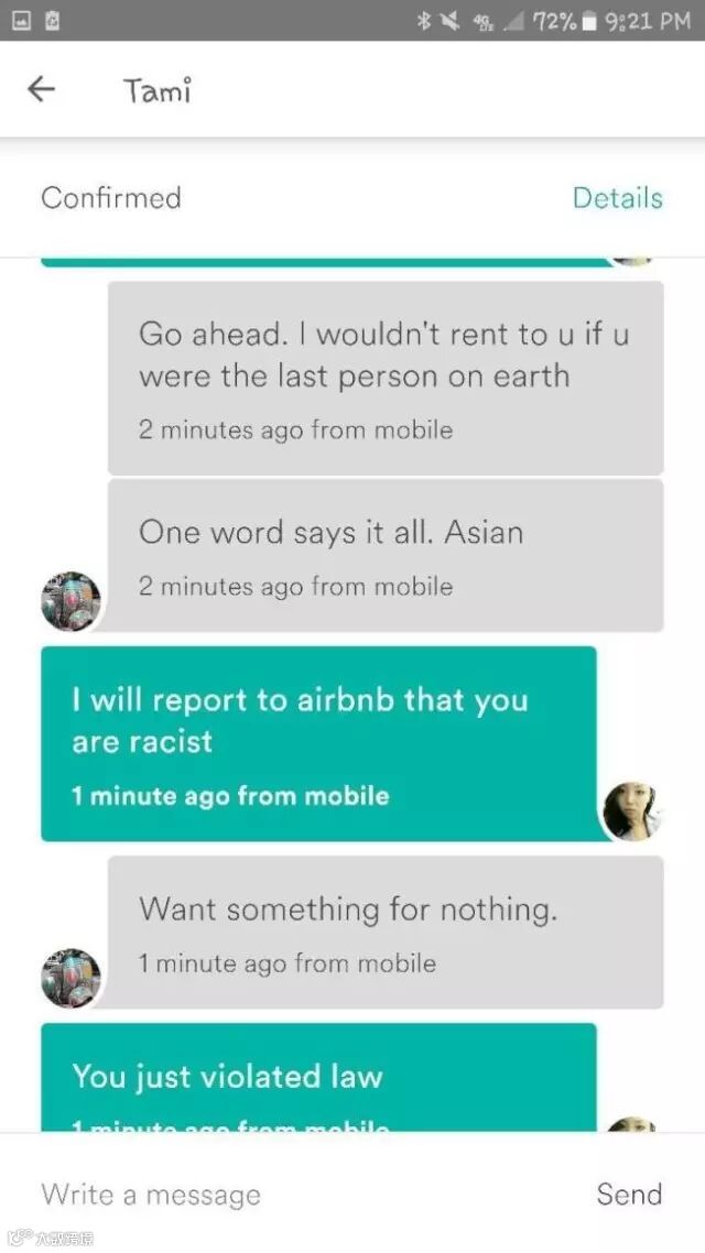 今年2月,Airbnb业主在发给Dyne Suh的信息中说,不会将位于大熊湖的木屋「租给一个亚洲人」,还说「这就是我们为什么需要川普。」