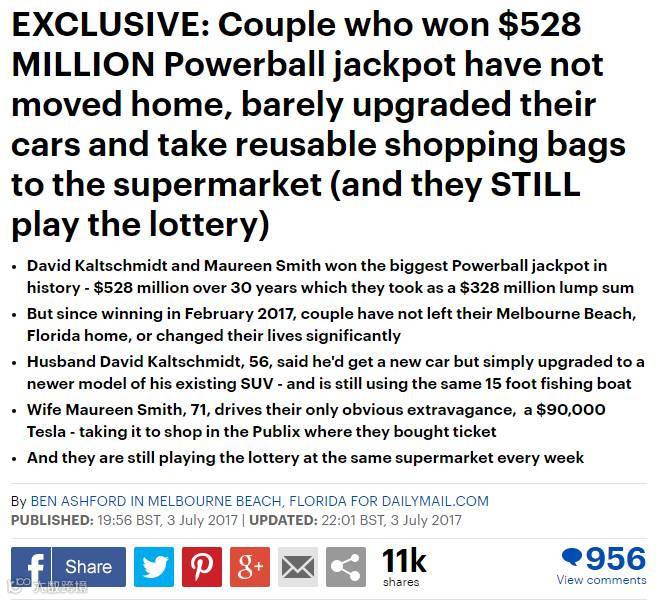 然而就在刚刚,又来了一记当头暴击。美国一对夫妇莫琳·史密斯(Maureen Smith)和丈夫大卫·卡茨米德(David Kaltschmidt)中得中奖概率只有千亿分之一的美国强力球头奖。