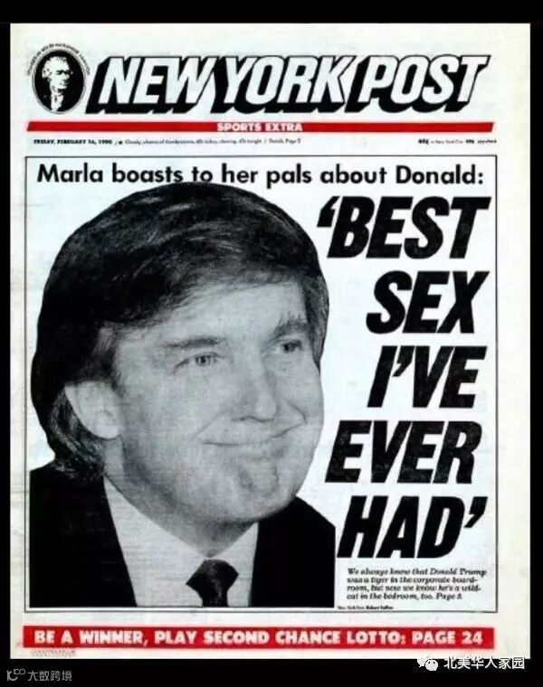 婚内插足不说,还特别高调。有一次,Marla在报道里说,川普提供了“她之前从来没有享受过的,最好的性爱 ”。这劲爆的一番夸赞之后,就有好多女人都想要约会川普的传言。